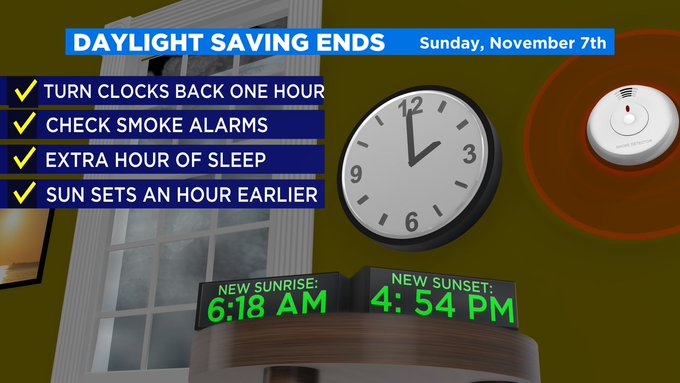 Clocks will fall back one hour at 2 am and well. The sun sets at 655 pm. When Daylight Saving Time ends the new sunrise time will be just after 6 am and the new sunset time will be right before 5 pm.